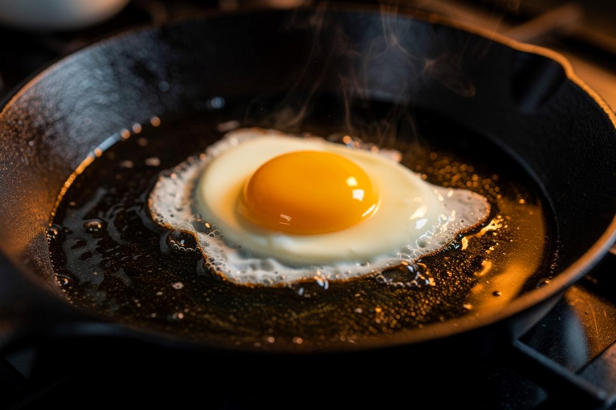 - 🥚 Metoda polega na smażeniu jajka na rozgrzanej patelni z odrobiną wody zamiast na tradycyjnym tłuszczu, co daje aksamitną teksturę białka i płynne żółtko.