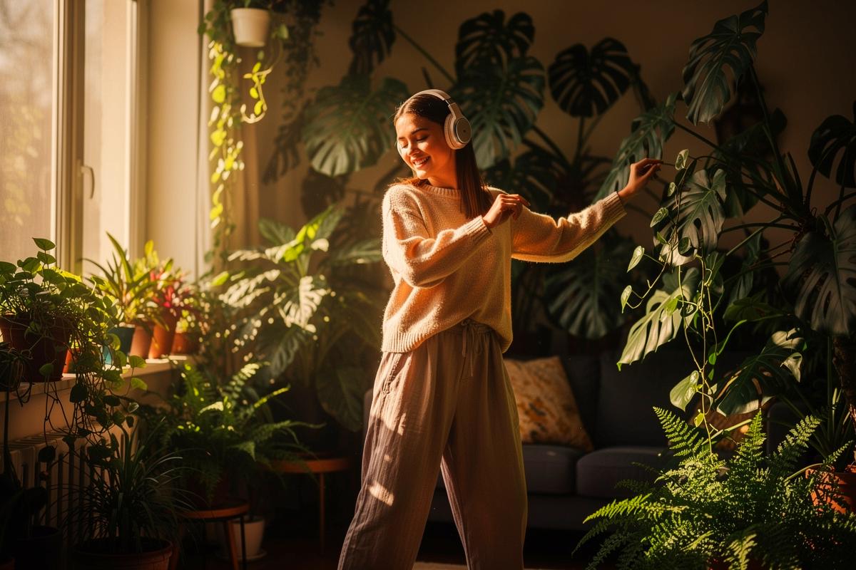 Nie chodzi o skomplikowane choreografie. Chodzi o spontaniczność i połączenie przyjemności. Wystarczy wybrać ulubioną muzykę – cokolwiek, co porusza ciało – i pozwolić mu poprowadzić się wśród liści. Można delikatnie potrząsać dłońmi nad koroną monstery, wykonywać płynne ruchy ramion wokół pnącego się epipremnum, czy po prostu kołysać biodrami obok donicy z sansewierią. Dotyk jest tu ważnym elementem; lekki kontakt dłoni z liśćmi podczas ruchu wprowadza dodatkowy wymiar sensoryczny. To praktyka dostrojenia się do własnego ciała i otoczenia jednocześnie.